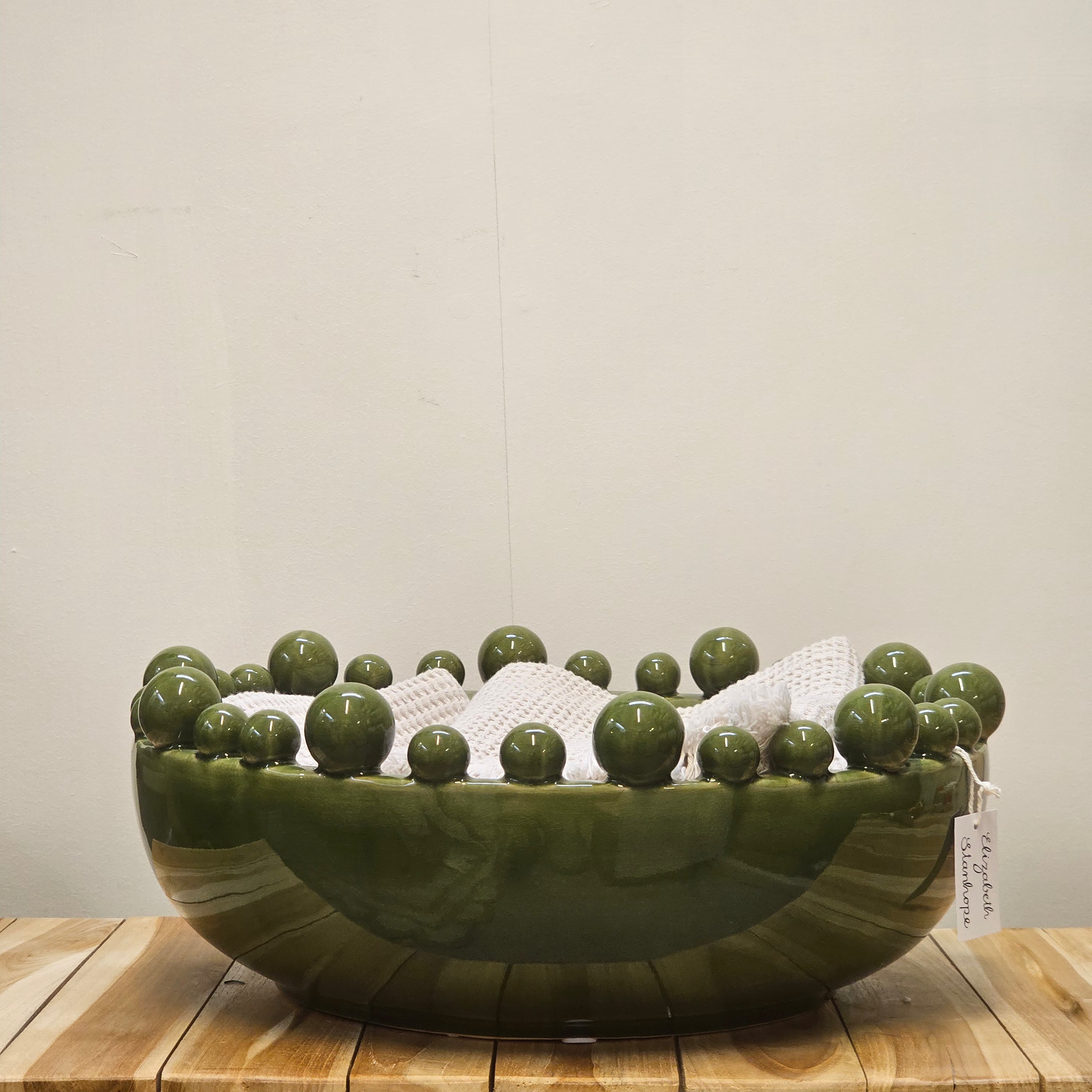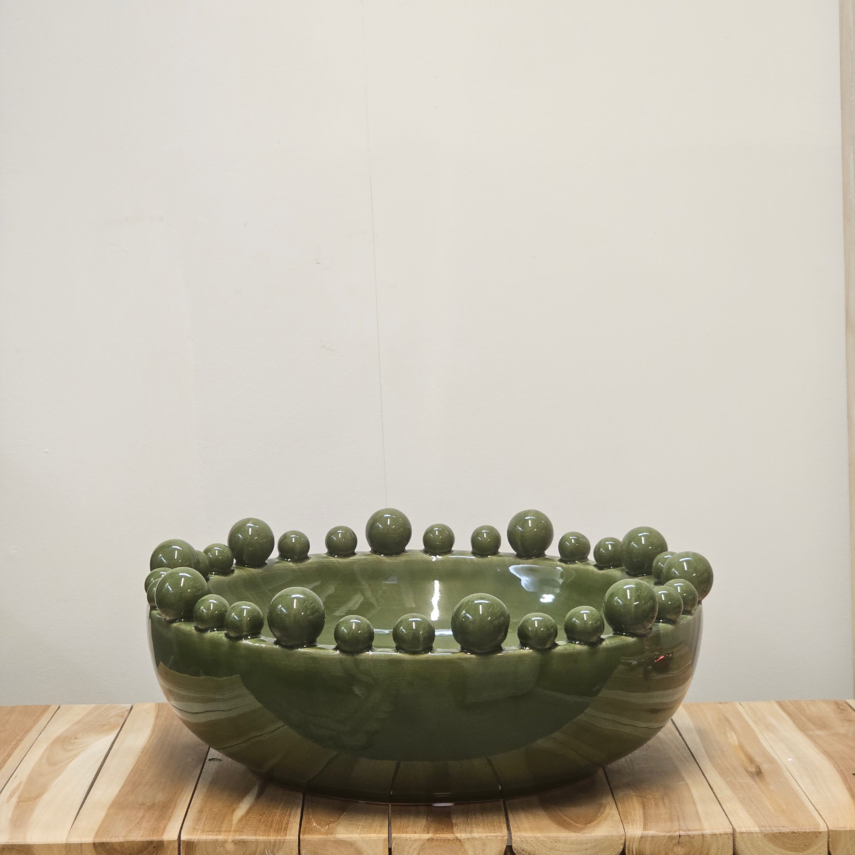 Our Bobble Bowl pairs striking design with artisan charm. Handmade and finished in a soft glazed blue, its bold bobble rim makes it a standout accent Our green bobble bowl is the perfect accent to any space. Its handmade qualities makes it one of a kind.