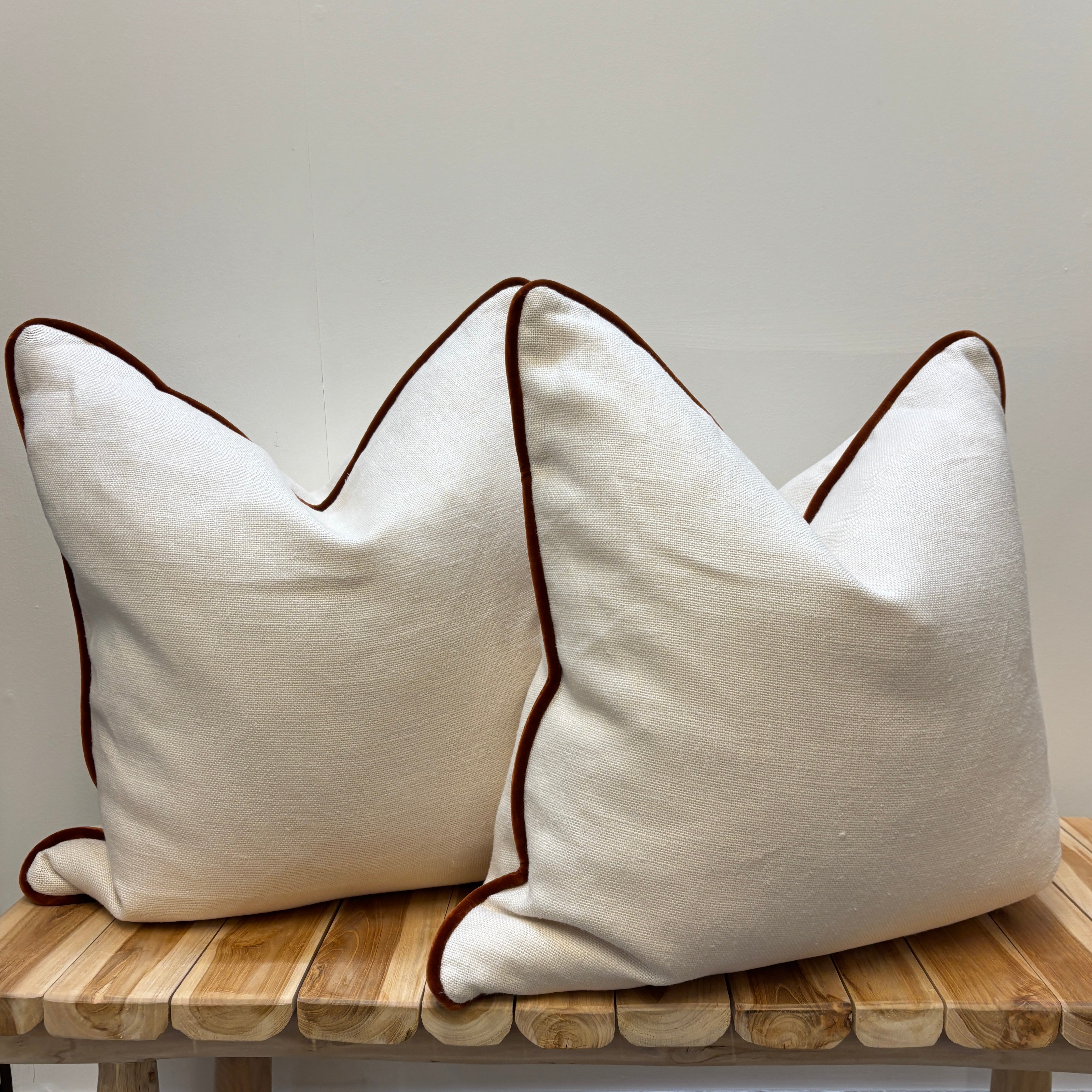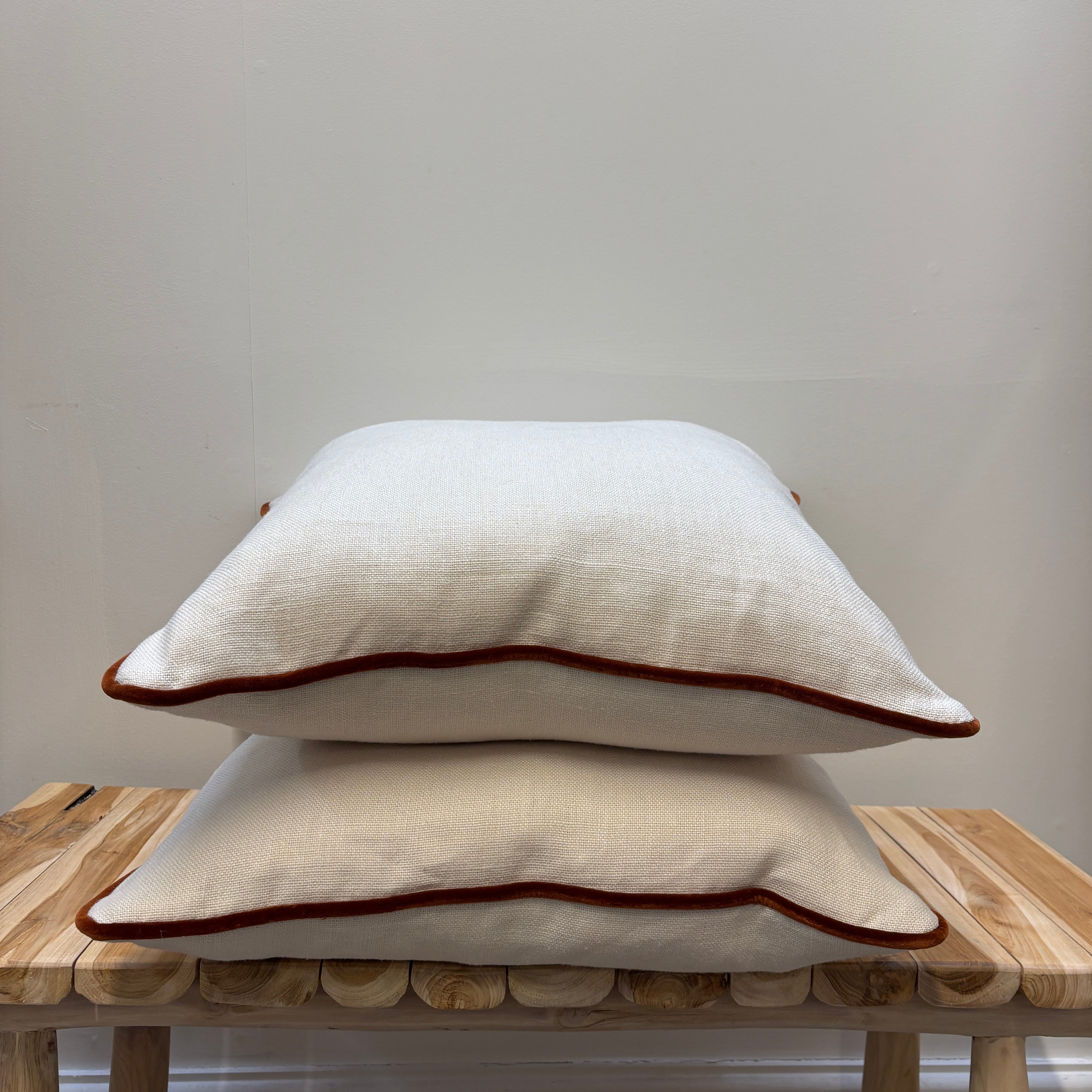 Our Foss cushion is crafted from a beautifully textured linen, trimmed with rich Vienna velvet piping in a deep rust tone. Understated yet elevated, this design brings subtle contrast and tactile interest to any space. Perfect layered with patterns or styled solo, it’s a timeless addition to both relaxed and refined interiors.