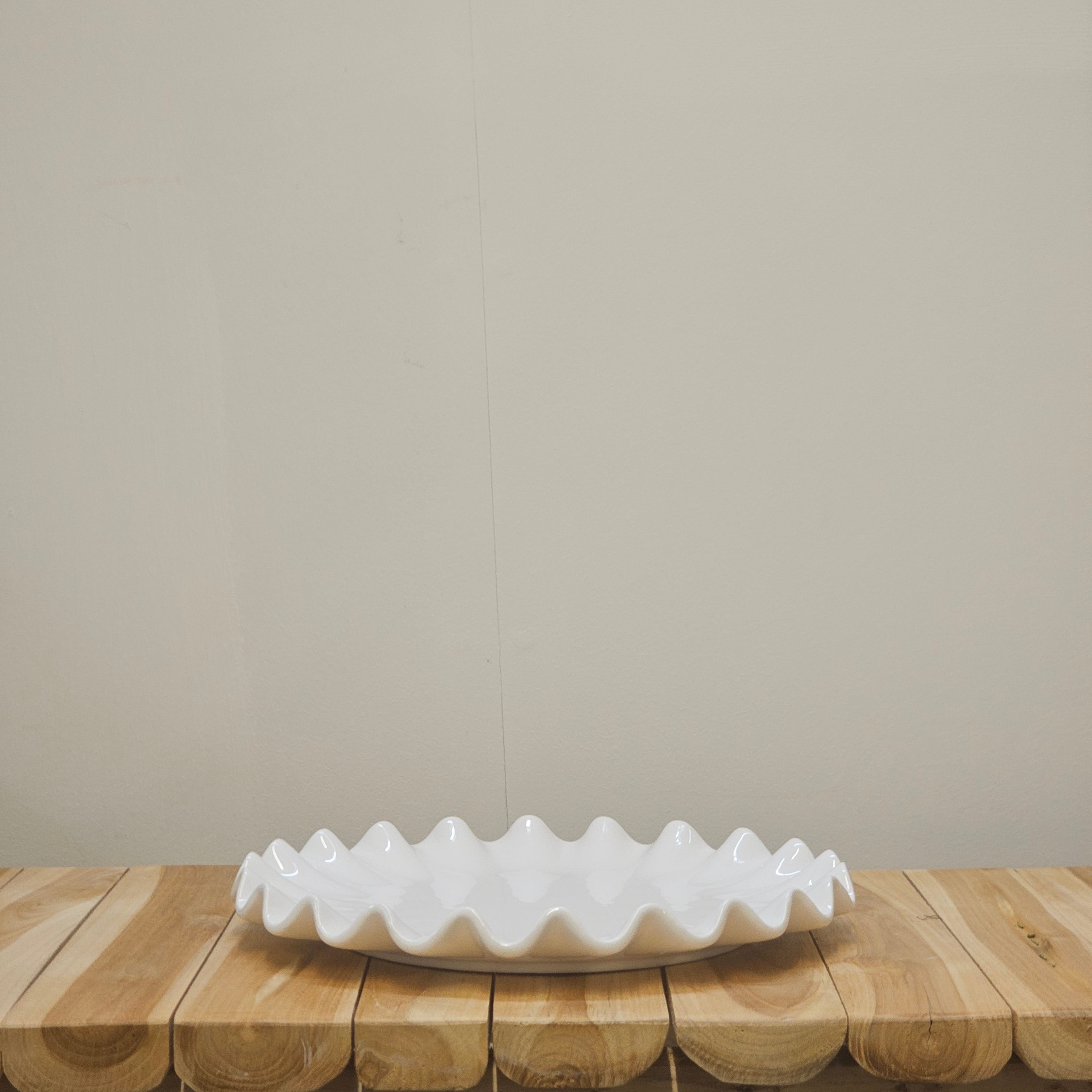 Serve your baked creations in style with our White Ruffle Cake Plate. Crafted from durable ceramic, it features a timeless ruffled edge that adds a touch of elegance to any table setting.